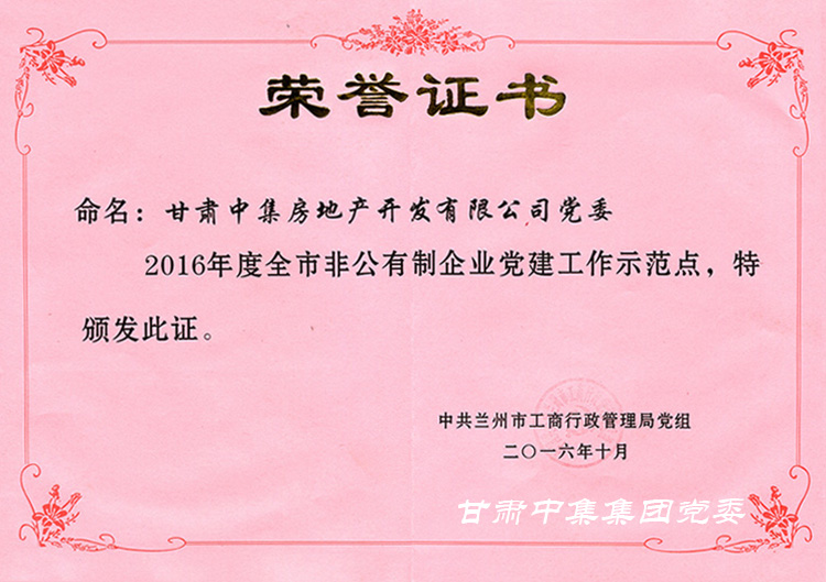 2017年10月10日,由蘭州市工商行政管理局評(píng)選的2016年度全市非公有制企業(yè)“黨建工作示范點(diǎn)”面向全市發(fā)布,甘肅中集房地產(chǎn)開(kāi)發(fā)有限公司黨支部喜獲全市非公有制企業(yè)“黨建工作示范點(diǎn)”殊榮并獲得由蘭州市非公委補(bǔ)貼黨建專項(xiàng)經(jīng)費(fèi)20000元。