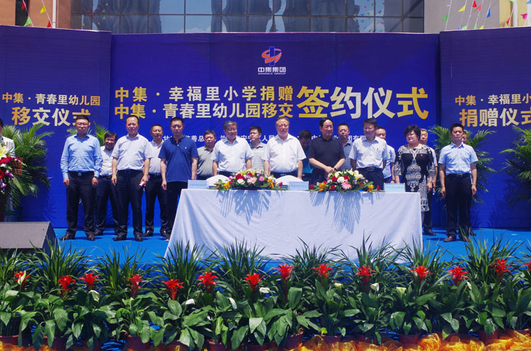 2017年6月22日下午14時,甘肅中集實業(yè)集團(tuán)有限公司通過甘肅省慈善總會,向蘭州市安寧區(qū)人民政府捐贈價值1.02億元中集•幸福里小學(xué)暨中集•青春里配建幼兒園移交儀式在中集•幸福里小學(xué)操場隆重舉行。甘肅省原人大常委會副主任、甘肅省慈善總會會長朱志良,甘肅省原民政廳黨組書記、廳長、甘肅省慈善總會常務(wù)副會長梁國安,甘肅省教育廳副廳長趙  凱,蘭州市人大常委會副主任孫曉鋼,蘭州市人民政府副秘書長淡漢榮,安寧區(qū)區(qū)委書記王  方及安寧區(qū)區(qū)委副書記、區(qū)長雒澤民攜安寧區(qū)委、區(qū)人大、區(qū)政府、區(qū)政協(xié)四大班子領(lǐng)導(dǎo),蘭州市教育局、蘭州市國土局、蘭州市規(guī)劃局、蘭州市房產(chǎn)局相關(guān)領(lǐng)導(dǎo)出席捐贈儀式,甘肅中集實業(yè)集團(tuán)有限公司黨委書記、董事長周啟濤代表公司完成與安寧區(qū)人民政府捐贈及移交簽約。
