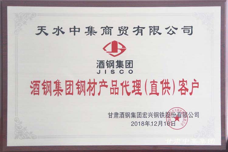熱烈祝賀甘肅中集實業(yè)集團(tuán)有限公司榮獲酒鋼集團(tuán)“2018年度金牌代理商”殊榮